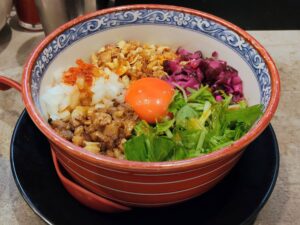 辛さは弱めにしてもらいましたが想像以上に辛い!でも麺はもちもちで癖になる味、まさに「辛ウマ」。スパイスの香りと舌の痺れ、多彩なトッピングで食感や味に飽きが来ません。麺を食べ終わっても汁と具がたくさん残るので、並盛ご飯で二度楽しめます。ただし、並の麺でも量が多いのと、〆ご飯の量が少ないと味が濃くなってしまうので注意。